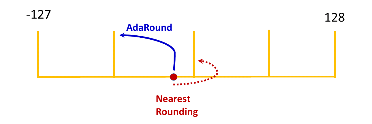 The following figure illustrates how AdaRound may alter the rounding of a quantized value.