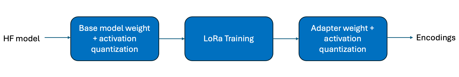 The QWA-LoRa workflow involves determining the appropriate weight and activation encodings for the base model before performing some epochs of LoRa training. Finally, the weight and activations for the updated LoRa layers are calibrated. This is expressed in the block diagram below.