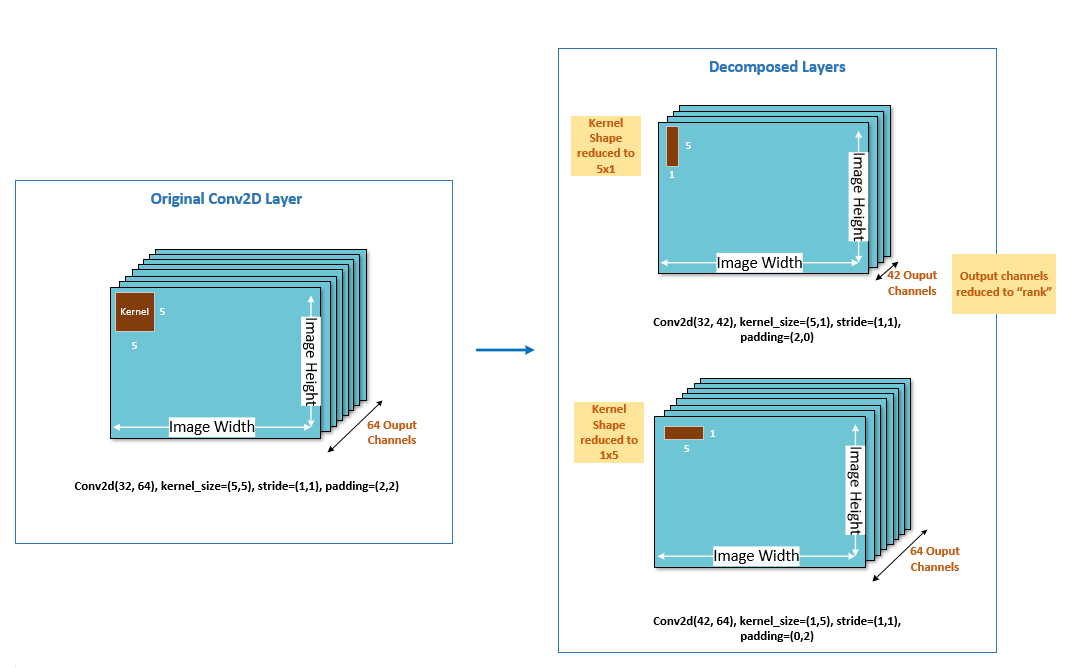 The following figure illustrates how spatial SVD decomposes both the output channel dimension and the size of the Conv kernel itself.