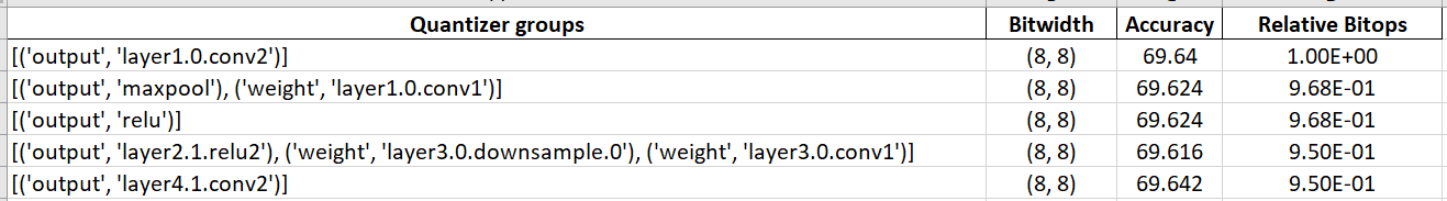 The algorithm performs a per-quantizer group sensitivity analysis. This identifies how sensitive the model is to lower quantization bit width for particular quantizer groups. The sensitivity analysis creates and caches an accuracy list that is used in following phases by the algorithm.
