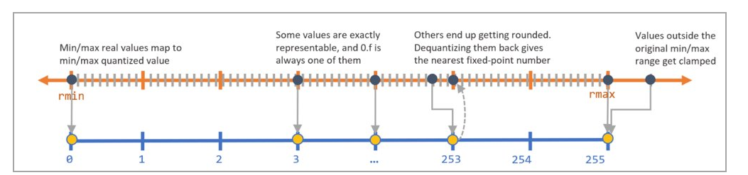 Following is a general definition for the quantization function, where a floating-point number x is mapped to its fixed-point representation (quantization) xintand then xint is approximated back to \(\hat{x}\) on the floating point axis (de-quantization).